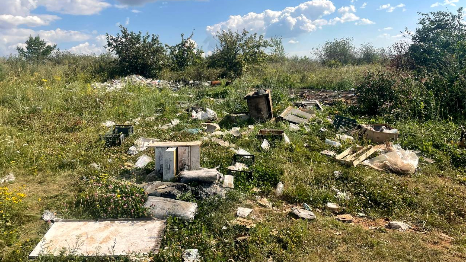 В этот раз территорию обследовали вместе с журналистами. На участке оказались бытовой мусор, мебель, металлический лом, полиэтиленовая пленка и стекло. На месте также обнаружены следы горения.