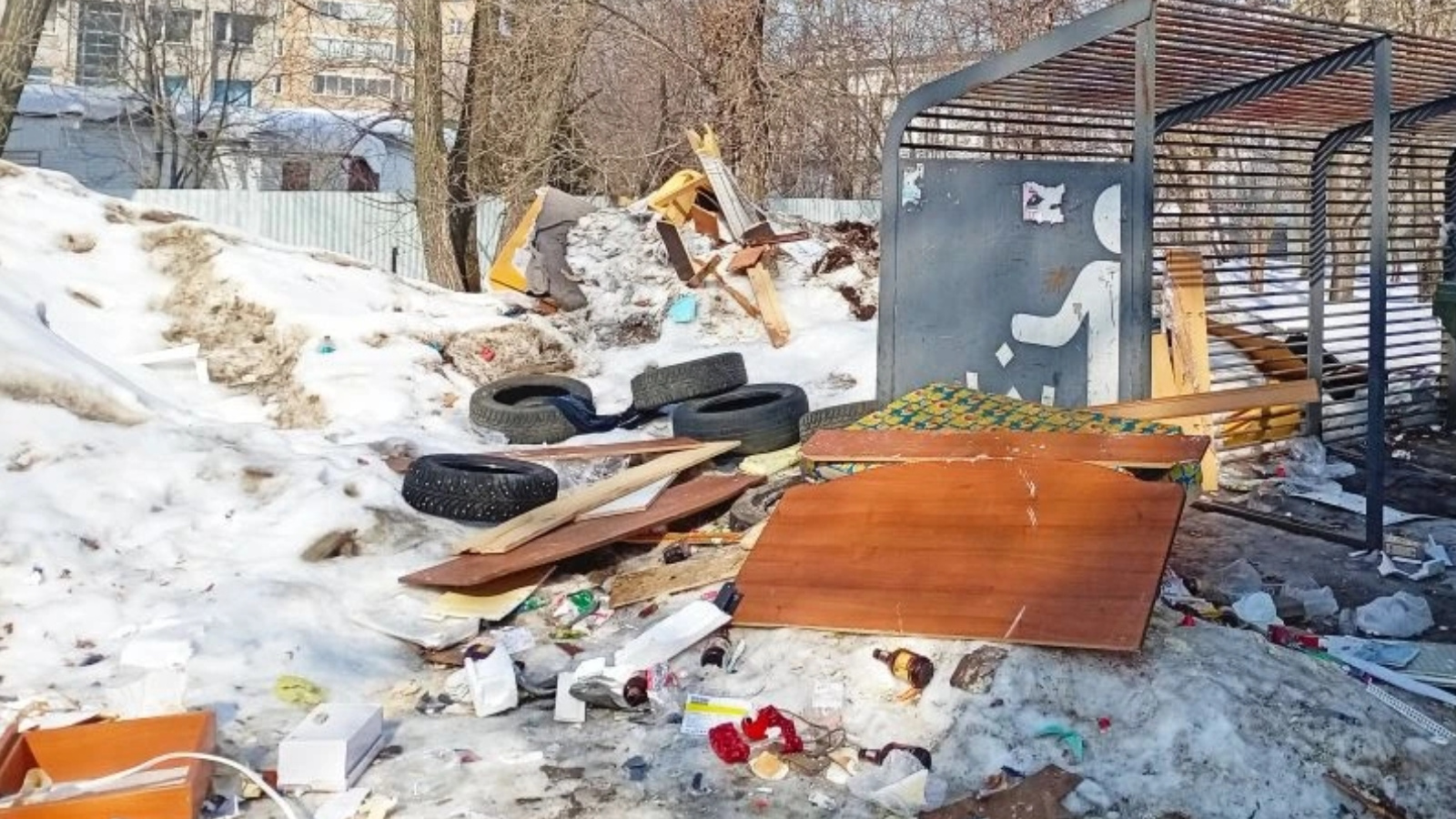 На территории, прилегающей к контейнерной площадке, экологи зафиксировали несанкционированное размещение отходов производства и потребления в виде боя стекла, отходов мебели, полиэтиленовой тары и автомобильных шин.
