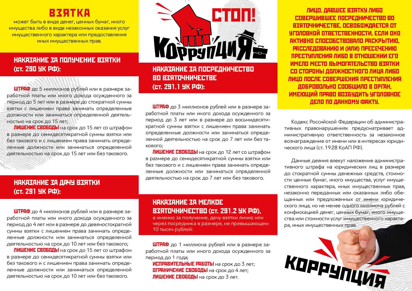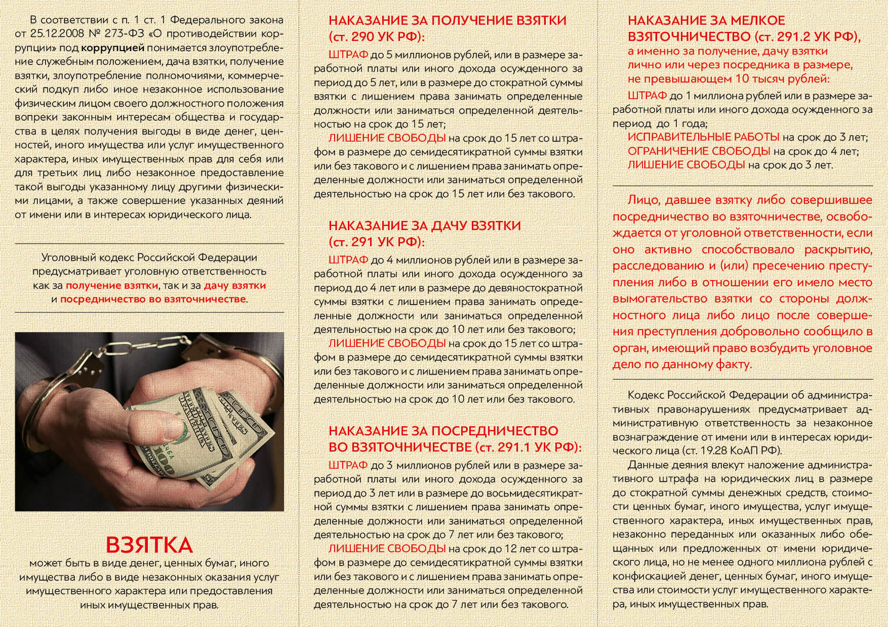 Памятка об уголовной ответственности за получение и дачу взятки и мерах административной ответственности за незаконное вознаграждение от имени юридического лица